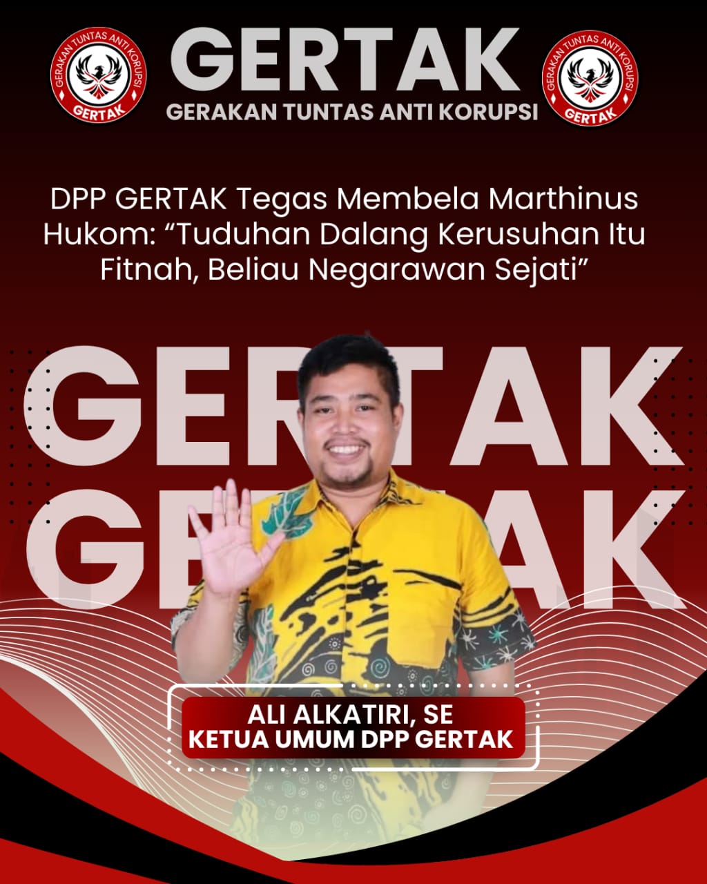 Ketua Umum DPP GERTAK, Ali Alkatiri, SE, menyebut tuduhan tersebut tidak benar dan sangat tidak berdasar. Menurutnya, sosok Marthinus Hukom dikenal sebagai figur berintegritas dan memiliki rekam jejak panjang dalam menjaga kepentingan bangsa.
