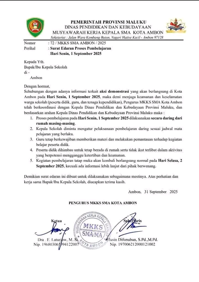 “Sehubungan dengan adanya informasi terkait aksi demonstrasi yang akan berlangsung di Kota Ambon pada Senin, 1 September 2025, maka demi menjaga keamanan dan keselamatan warga sekolah, sekolah diliburkan sementara,” demikian bunyi surat edaran yang ditandatangani Ketua MKKS SMA Kota Ambon Dra. E. Laturiuw bersama Sekretaris Husin Definubun, Minggu (31/8/2025).