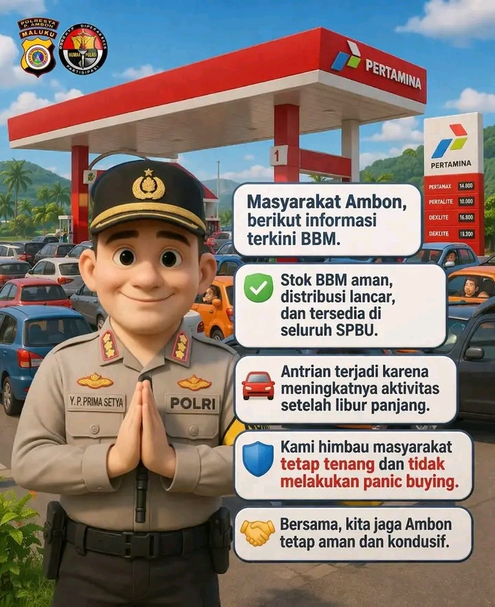 Kapolresta Pulau Ambon dan Pulau-Pulau Lease, Kombes Pol Yoga P. Prima Setya, menegaskan bahwa stok BBM masih mencukupi dan distribusi berjalan lancar di seluruh SPBU di wilayah Ambon.